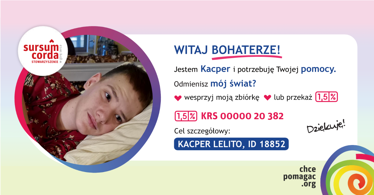Cześć wszystkim! Niektórzy z was już mnie poznali. Chciałbym serdecznie podziękować za waszą ogromną pomoc w moim leczeniu. Dobro zawsze wraca, a ja jestem przekonany, że wróci również do was. Dzięki waszemu wsparciu mogę skorzystać z pomocy różnych specjalistów. Ja i moi rodzice bardzo doceniamy waszą hojność i mam nadzieję, że dobro, które od was otrzymujemy, będzie trwać. Bez waszej pomocy nie bylibyśmy w stanie sprostać kosztom dalszego mojego leczenia. Dziękujemy z całego serca!