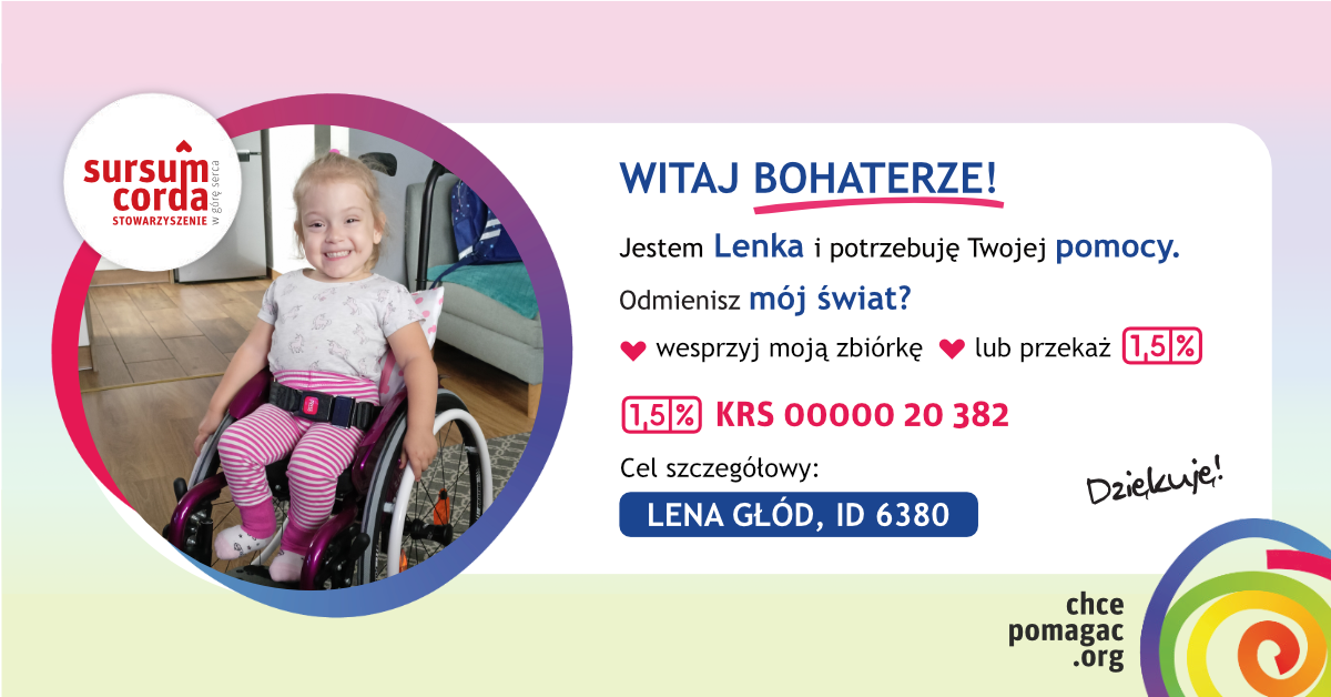 Drodzy! Nazywam się Lenka i od urodzenia walczę z rozszczepem kręgosłupa, co powoduje niedowład obu nóg. Dodatkowo mam pęcherz neurogenny, co wymaga cewnikowania co 3 godziny. Moi rodzice robią wszystko co w ich mocy, by mi pomóc, ale koszty związane z rehabilitacją, wizytami u specjalistów oraz sprzętem ortopedycznym są ogromne. Proszę Was o wsparcie finansowe. Każda darowizna przyniesie mi ulgę i poprawi jakość życia. Dziękuję z całego serca. ![]()