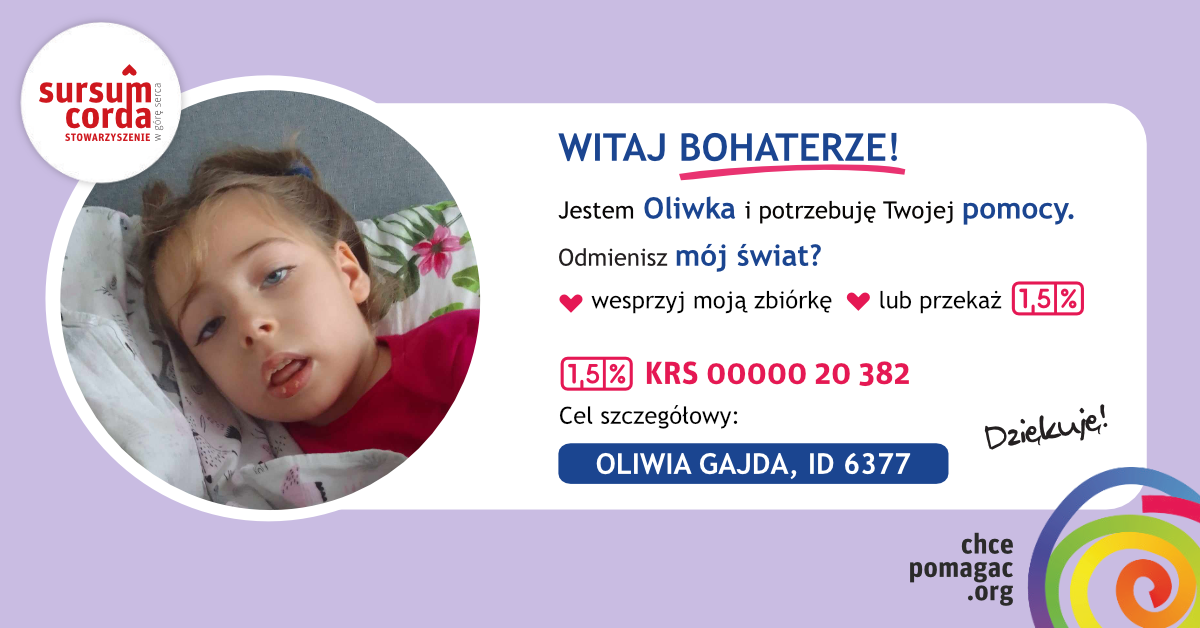 Cześć, mam na imię Oliwka. Jestem największym szczęściem moich rodziców. Niestety, w styczniu 2021 roku nasze życie zostało wywrócone do góry nogami. Po kilku miesiącach przyszły wyniki, które wskazały, że cierpię na bardzo rzadką chorobę – CLN2. Mój stan zdrowia zaczął bardzo szybko się pogarszać. Obecnie już nie chodzę, nie widzę, jestem karmiona przez PEG-a. Potrzeby związane z moim leczeniem są bardzo wysokie, gdyż potrzebuję dużo lekarstw, suplementów i kosztownych sprzętów medycznych do codziennego funkcjonowania. Moim marzeniem jest zakup przez rodziców samochodu z windą dla osób niepełnosprawnych abym mogła być bezpiecznie przewożona. Każdy gest ma znaczenie. Pomożesz?
